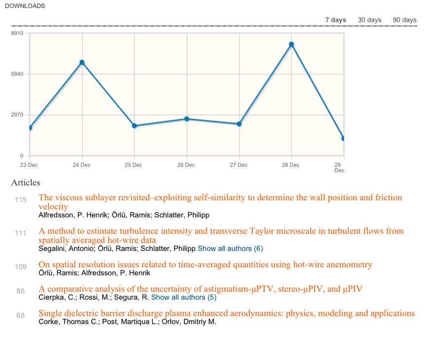 Three FLOW articles amoung the recent most down-loaded papers in Experiments in Fluids