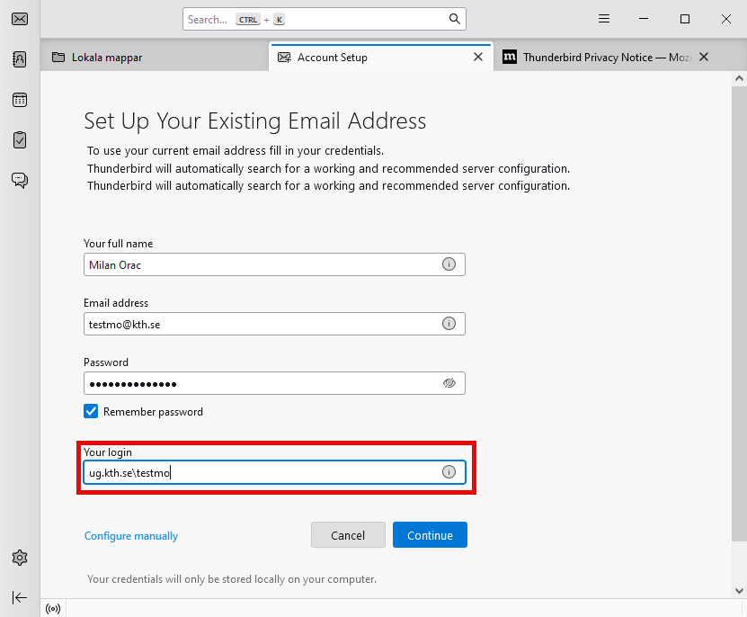 - Open Thunderbirdand start with setting up your existing e-mail address. Fill in your name, KTH e-mail address and password and click on "Continue"