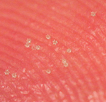 Zoomed-in image of microspheres on an index fingertip. Photo: William Ferreira Andrén.