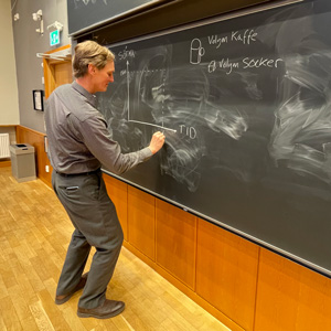 – I ett klassrum är det viktigt att tillföra energi och använda sig av vardagliga exempel, menar Pär, och har strax ritat ett diagram på tavlan och förklarat de grundläggande problemen inom termodynamik och kinetik med hjälp av kaffe och socker.