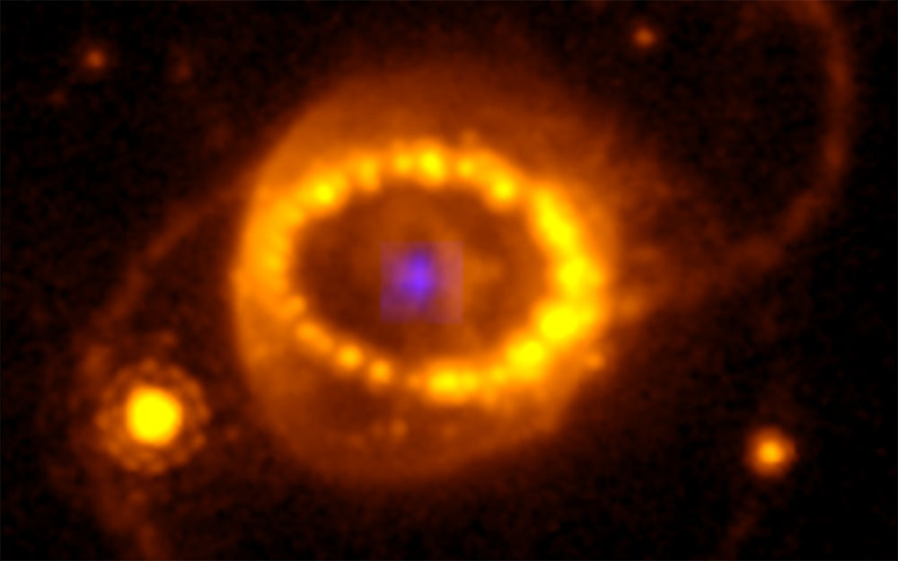 – En neutronstjärna eller ett svart hål. En neutronstjärna består av en tätt packade neutroner och har en densitet som är ungefär hundra biljoner högre än jordens. Ett svart hål har ett så starkt gravitationsfält att ingenting, inte ens ljus, kan ta sig därifrån. Ett svart hål har inte heller någon fast yta. Observationerna från James Webb teleskopet visar att det kompakta objektet i Supernova 1987A med största sannolikhet är en neutronstjärna. Strålningen från neutronstjärnan har hettat upp närbelägen gas från den sönderslitna stjärnan, vilket ger upphov till den signal vi nu observerat.