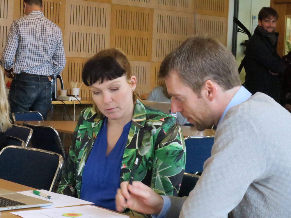 Entreprenörer som Aniela Hotlink, en av vinnarna av Global Change Award 2018, har fått coaching med KTH:s Innovation Readiness Level Model. Till höger: Gustav Notander, affärsutvecklingscoach på KTH Innovation. Foto: David Callahan