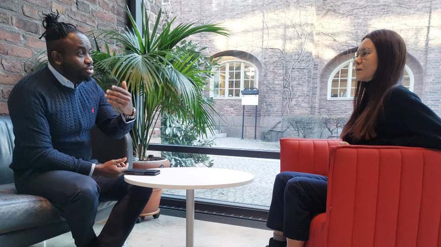 Entrén till KTH bibliotek är ljus och luftig. I en nedsutten skinnsoffa sitter Jerry Onyeche, facilities manager på Shurgard som erbjuder magasineringslösningar. Mittemot honom sitter Marina Brandt, masterstudent inom Fastigheter och byggande. Det är förmiddagssol ute och ljuset faller på den stora palmväxten vid fönstret, bakom mentorparet. Det är bara tre månader sedan de träffades för första gången, men det är uppenbart att de trivs i varandras sällskap.