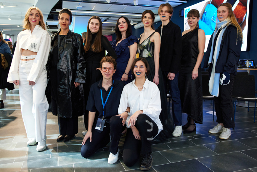 Sminket som modellerna i catwalken har smyckats med är specifikt framtaget för modevisningen. Företaget bakom det heter Ellure, som är en startup från KTH som vill minska överproduktion i kosmetikabranschen. Deras läppstift är 3D-printat, berättar Katarina Lindmark, en av modellerna som går andra året på internationella kandidatprogrammet i informations och kommunikationsteknik på KTH.