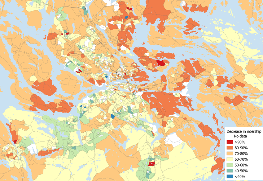 Ett mönster framträdde där resenärer från resurssvaga områden med låg utbildningsnivå och många utrikesfödda i högre grad än andra fortsatte att resa kollektivt. Bland dem som bromsade in resandet mest var personer från villaförorter med de högsta inkomsterna och högsta utbildningsnivåerna.
