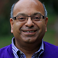 Porträttfoto av Prosun Bhattacharya, professor vid KTH. Han har en blå pullover samt skjorta och är mycket glad.