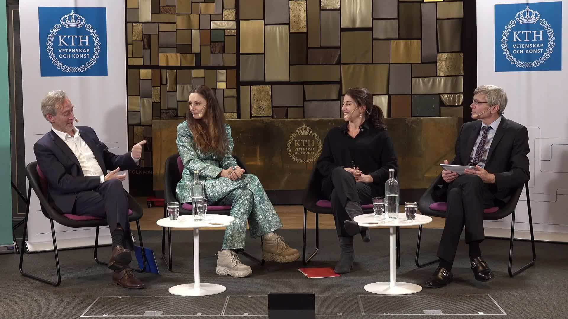 Dilsa Demirbag-Sten, generalsekreterare på Berättarministeriet samtalar med Danica Kragic, professor i datalogi vid KTH och Gustaf Arrhenius, professor i praktisk filosofi och VD för Institutet för framtidsstudier om vikten av en jämlik och god utbildning i ett högteknologiskt samhälle. Moderator Per Svensson fördelar ordet.