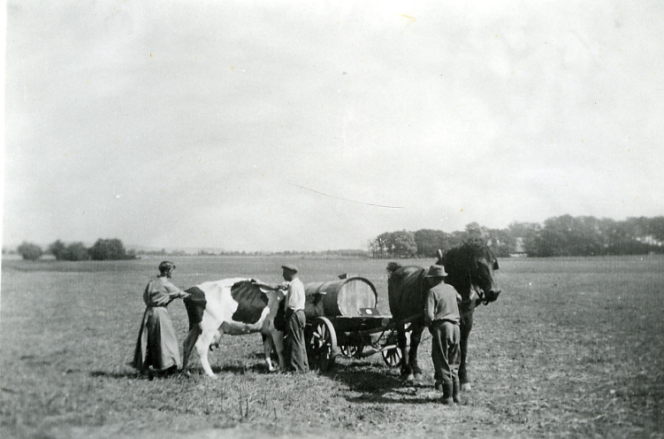 Human-bovine interaction in the field: veterinarian Sten Nordlund inseminates a grazing cow, 1948. From the collections of the Swedish Veterinary Museum