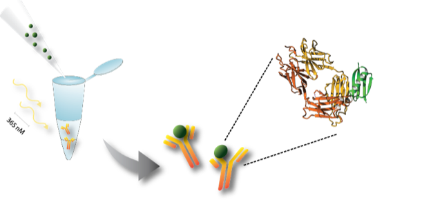 Introduction of the unnatural amino acid p-benzoylphenylalanine in the sequences enables the formation of covalent bonds to the nearby antibody when the complex is exposed to long wave UV light. The domains have been equipped with a unique cysteine for easy coupling to virtually any kind of functional ligand.