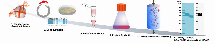 After harvest the proteins are affinity purified using the C-terminal purification handle and a high-throughput protein purification protocol developed in house. The purity and glycosylation patterns of the purified proteins are determined using SDS-PAGE and Western blot. MS/MS is finally used to verify the identity of the protein.