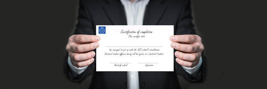 Doktorander kan själva generera intyg från Ladok (det studieadministrativa systemet) via länken: www.student.ladok.se/student/app/studentwebb/intyg . Denna webbsida kan också nås via Tjänster när man är inloggad på kth.se, och sedan Intyg under Ladok för studenter.