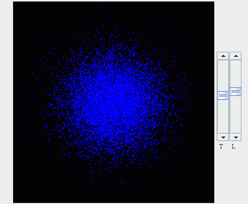 Skriv ett fristående Java-program som simulerar ett stort antal små partiklar som rör sig slumpmässigt och oberoende av varandra i tvådimensio ner. Programmet ska rita upp partiklarna i aktuella lägen vid olika tidpunkter så att en rörlig bild erhålls och visar hur partiklarna sprids med tiden. Användaren ska kunna påverka simuleringen medan den pågår. Man ska kunna ändra någon eller några parametrar och ev. också få ut statusinformation från simuleringen. Det ska finnas minst tvåo lika möjligheter till interaktion med programmet. När partiklarna når kanten av ett rektangulärt område ska de "fastna" på kanten, som om de klibbade fast och andra partiklar ska i sin tur kunna fastna på dessa (se tips längre fram). Programmet ska ha en modulariserad struktur med en vettig uppdelning på klasser med olika ansvarsområden. De simulerade partiklarna ska vara separata objekt. Du vill kanske lägga det tjusiga färdiga programmet på din egen webbsida. Det är ganska lite arbete att göra om det till en applet i så fall.