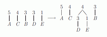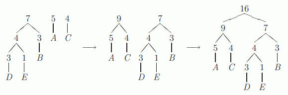 tecken frekvens A 5 C 4 B 3 D 3 E 1 För att bygga kodträdet skapar man fem noder utgående från frekvenstabellen. Varje nod innehåller en frekvens och ett tecken. Kodträdet byggs nu genom att hela tiden välja de två noder som har lägst frekvens, och skapa en ny nod av dem. Den skapade noden ersätter de båda utvalda noderna, och får som frekvens summan av de båda utvalda nodernas frekvenser. För att lättast kunna välja de två med lägst frekvens kan man hålla noderna sorterade med avseende på frekvens. I fallet ovan får man