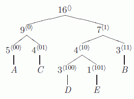 A 00 2 C 01 2 B 11 2 D 100 3 E 101 3 För att koda ett meddelande byts varje tecken i meddelandet ut mot respektive kod. I fallet ovan blir det kodade meddelandet: