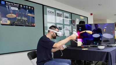 | Room for Sound? is a virtual experience where a user performs live music to an audience in real life that send their feedback back to the VR through their phones. | |