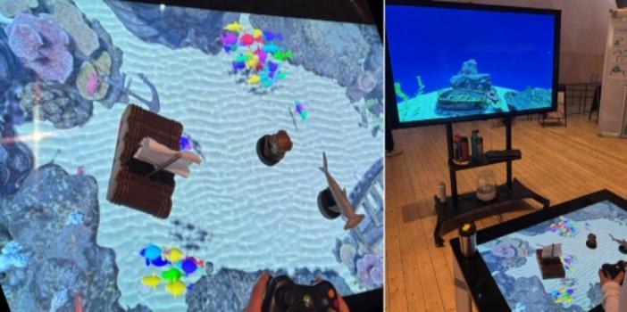 Join us for a calming and peaceful underwater experience! Design your custom fish on your mobile phone, then swipe to Swish the Fish into our underwater environment. Interact with the fish using our shark and boat props, or get a closer look with our diver camera view. Keep on swimming!