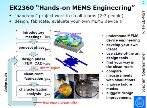 The course is designed as a “hands-on” project course for students who would like to experience the world of nano/microelectromachnical systems (NEMS/MEMS) by having a "hands-on" experience, i.e. by carrying out a microsystem engineering project by designing, fabricating and evaluating tiny but complex devices of sub-millimeter size. This course is given annually, in the 2nd period of every autumn term at KTH (HT-P2; typically last week of October to second week of December).