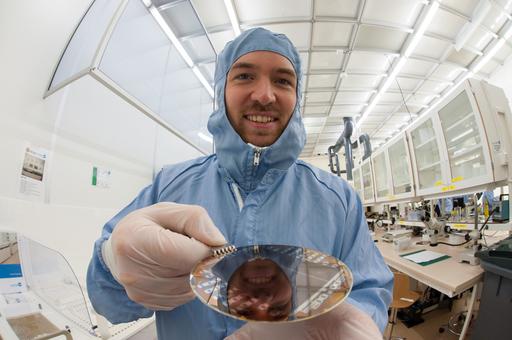 Students (2012 course) fabricating their microsystems in KTH's clean-room. The microsystems are fabricated on such silicon wafers.