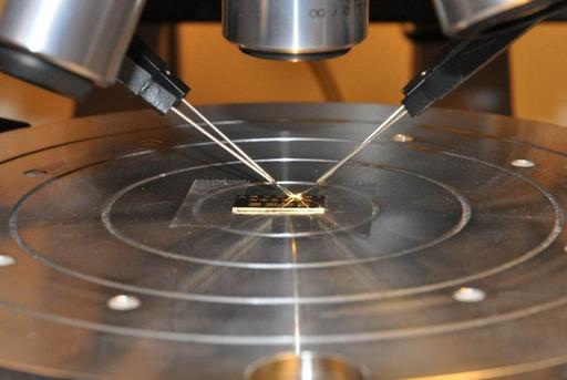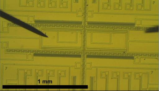 Microscope picture of a microsystem chip fabricated by the students (2011 course run). The probe needles are used for feeding the microsystem actuators with electrical potential, to generate mechanical movements. This chip worked as expected!