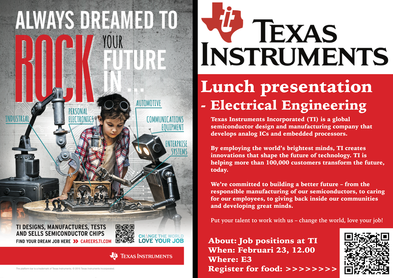Texas Instruments visits Konglig Elektrosektionen with a lunch presentation to talk about available job positions on Tuesday (23rd February). After the presentation master students will have an opportunity to sign up for interviews. The interviews will be held on KTH the 25th February.