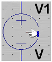 Placera spänningskällan med musen, klicka och tryck sedan på <esc>. Spänningskällan har beteckningen/namnet V1 och värdet/modellen V.