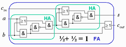 Som förberedelse har Du resonerat Dig fram till vilken sanningstabell som måste gälla för en heladderare. Nedan är en krets som påstås vara en "heladderare".
