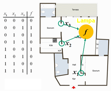 Antag att vi behöver kunna tända/släcka vardagsrummet från tre olika ställen.