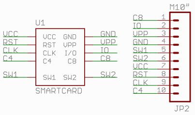 Ett SmartCard har åtta kontaktytor, men i praktiken har man som användare bara tillgång till en enda pinne C7 (RB7). De övriga kontaktytorna används som matningsspänning, jord, reset, och klockpulser.