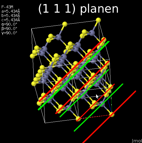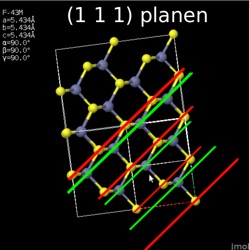 Här nedan ritade jag planen (111) i diamant strukturen (samma som ZinkBlender), vi ser då att de röda planen inte går igenom de lila atomerna, på samma sätt så går ingen grön plan genom någon gul atom.