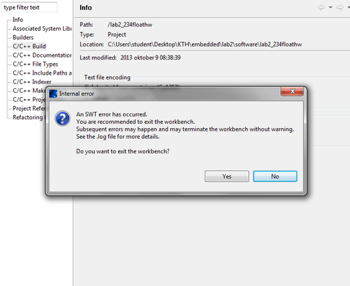Nios II IDE v10 generates an SWT handler error message when choosing C/C++ Build from the project properties screen. I use native Windows 7 installation. Can you tell me what I can do to resolve it?