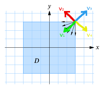@Annie: Punkten (x,y) är fix och lika med (1,1). I den punkten optimerar du \(f'_{\boldsymbol{v}}(1,1)\) över alla enhetsvektorer v = (h,k) som pekar in i D (dvs h ≤ 0 och k ≤ 0) och om (h,k) ska vara en enhetsvektor måste h² + k² = 1. Det är därför du får en enhetscirkel att optimera över.