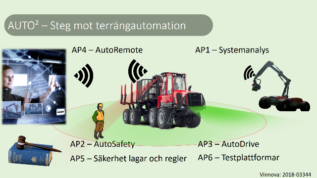 Skogforsk är projektledare för Auto2. Björn Möller på KTH Mekatronik kommer leda arbetspaket AutoDrive. Huvuduppgiften är att ta fram och implementera en sensorenhet som möjliggör halvautonoma skogsmaskiner. Detta kommer att demonstreras på en nerskalad skogsmaskin samt på slutet en fullskalig maskin. Auto2 projektet löper över 2 år (Nov 2018-Dec 2020).