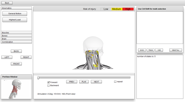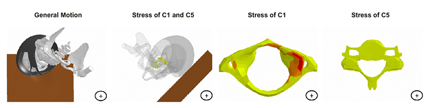 Figur 2. Utdrag från VIS-ED, som visar påfrestningar i C1 och C5 i en motorcykelolycka