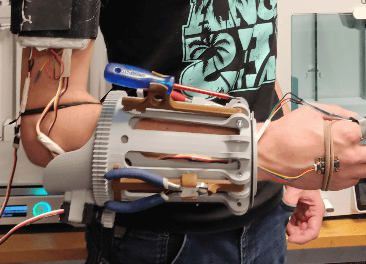 “My project is a toolholder that rotates tools around your arm via motion control. If you want to use one of the tools, you use a flicking motion to flick the tool in your hand. The microcontroller (a tiny computer to run the program to control the motor) and battery are mounted on my upper arm. The idea is that people download the 3D files to print their own holder and design and print toolholders to fit their own tools, making it a personal and modular design.”
