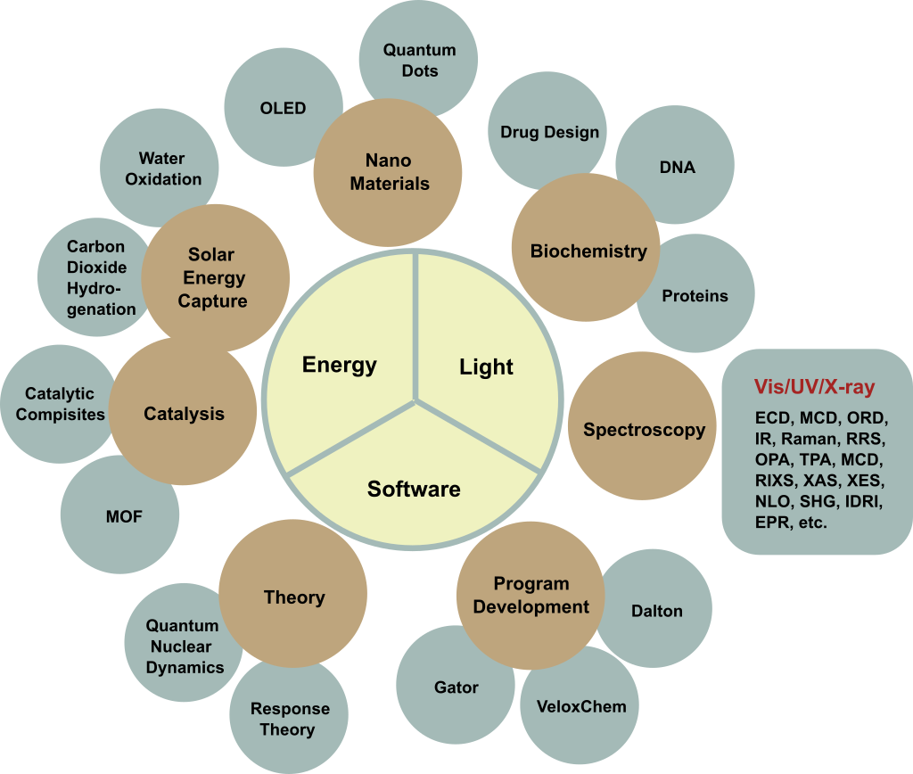 We cover a broad spectrum of activities in theoretical chemistry, physical chemistry, and biochemistry. A coarse grained view of our projects is provided in the chart below, with a core divided into the areas of software , energy , and light .