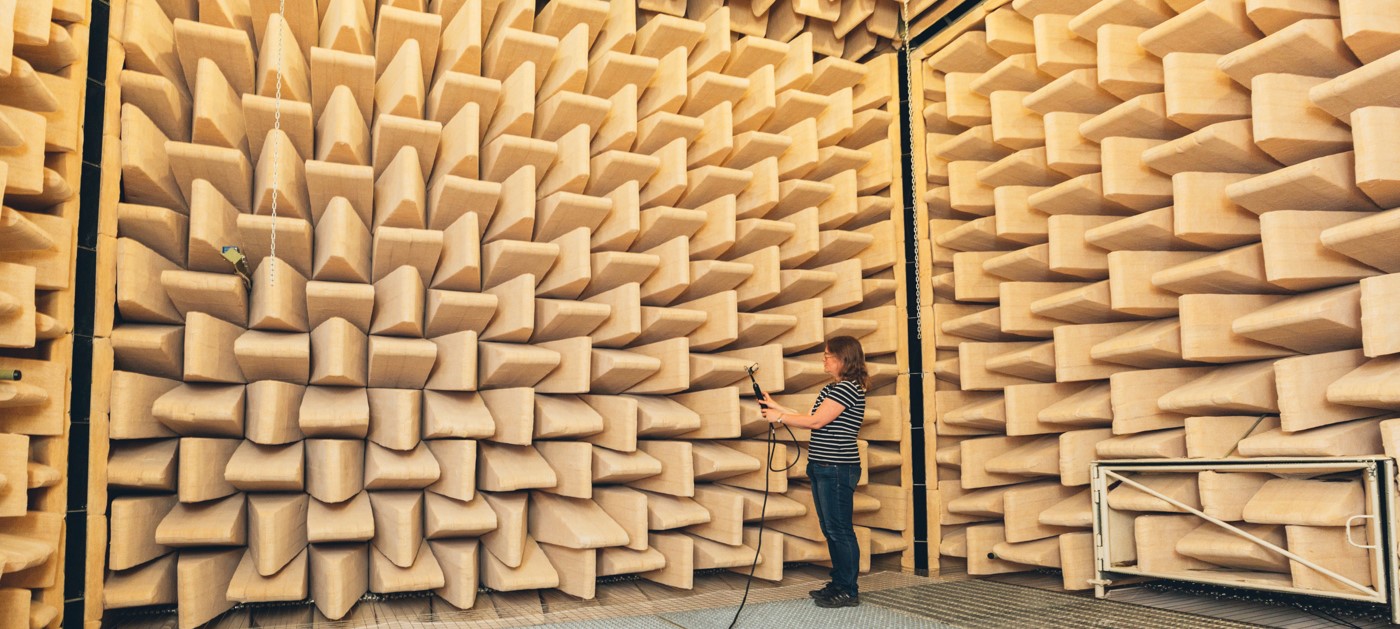 Vårt halvekofria rum har dimensionerna 9,05 × 5,95 × 4,6 m3 och är designat för att uppfylla standardiserade krav ned till 100 Hz. Om mätobjektet inte är för stort kan den nedre gränsen sträckas till 80 Hz. Typiska mätningar i det halvekofria rummet är: