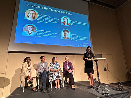 The panel consisted of Lara Fowler (Professor of Teaching, interim Chief Sustainability Officer & interim Director of the Sustainability Institute at Penn State University, USA), Roxana Marin (Vice President, Xylem Europe Central & Nordics Region), Timos Karpouzoglou ( Researcher, Division of History of Science, Technology & Environment at KTH Royal Institute of Technology, Sweden),